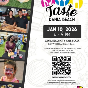 The City of Dania Beach presents Dania After Dark’s Taste of Dania Beach, on Saturday, January 10, 2026, from 6 p.m. to 9 p.m., at City Hall Plaza, 100 W Dania Beach Blvd.